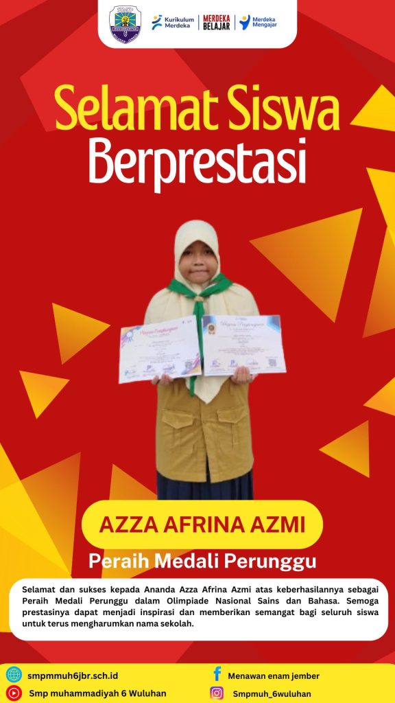 Selamat dan sukses kepada ananda Azza Afrina Azmi kelas 7C atas keberhasilan sebagai peraih medali perunggu dalam ajang kompetisi nasional bertajuk ONSB (Olimpiade Nasional Sains dan Bahasa) tahun 2025 dan Olimpiade Nasional Matematika, Ilmu Pengetahuan dan Bahasa (ONMIPASA) Tahun 2025. Semoga prestasinya dapat menjadi inspirasi dan memberikan semangat bagi seluruh siswa untuk terus mengharunkan nama sekolah